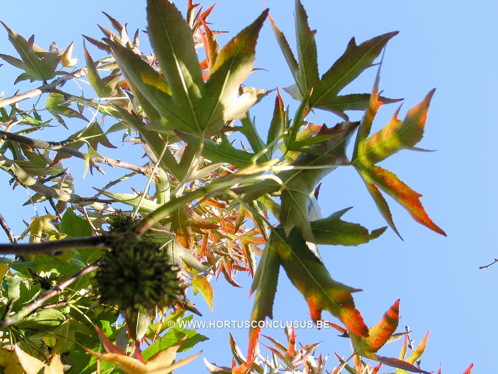 Omschrijving: Deze amberboom heeft een meer stervormig diep ingesneden blad dan zijn gewone broer. Hij heeft bovendien een goede wijnrode herfstverkleuring en trage groei.